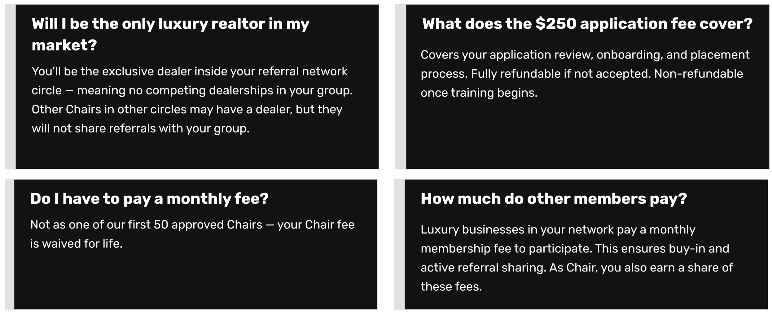 We recommend one Chair per defined submarket or niche to avoid internal competition and keep referrals crisp. This exclusivity ensures you remain the central connector in your territory. Additional realtor members can join other circles, while Chairs maintain control over network curation.