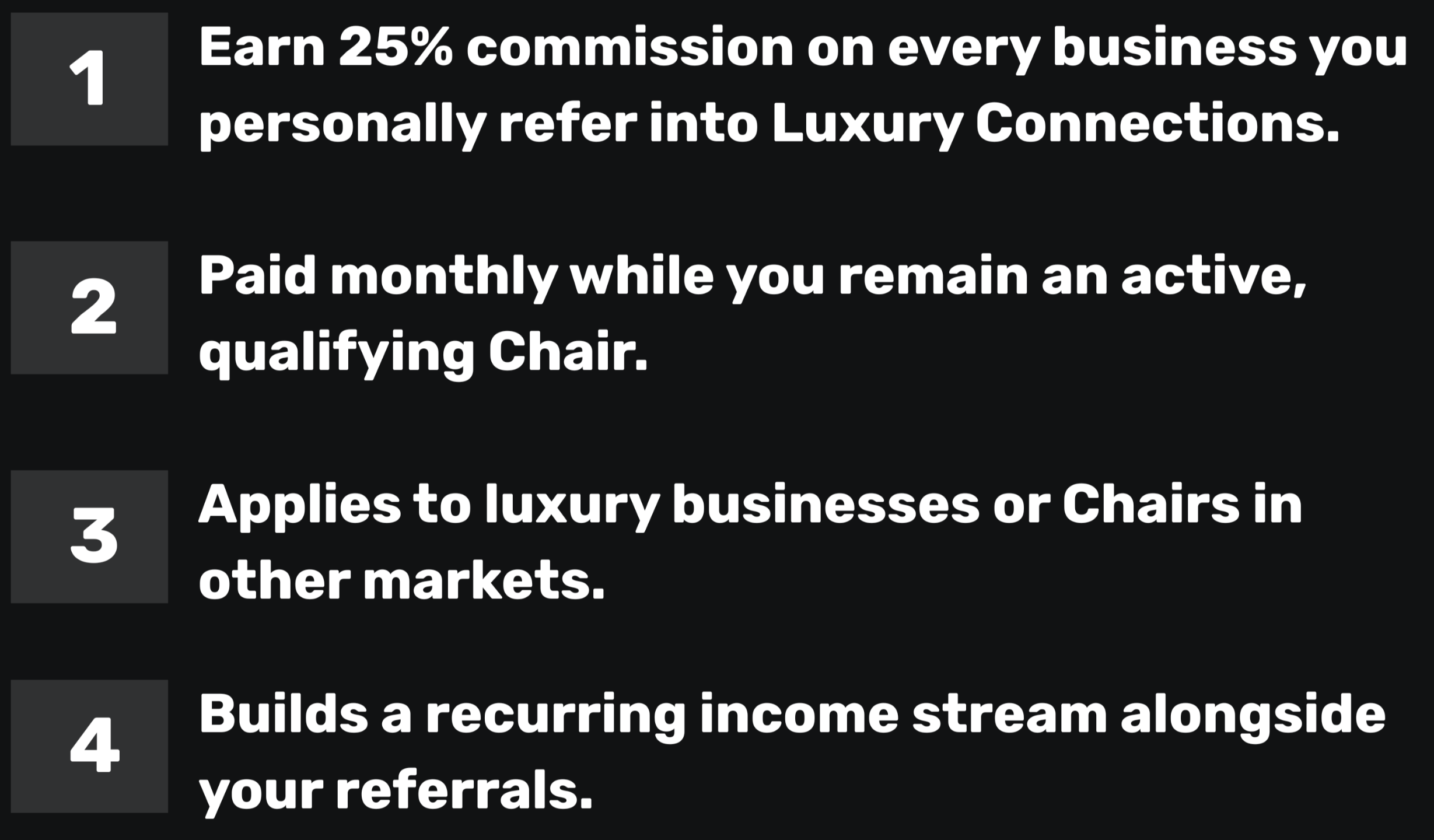 Yes. As a Chair, you earn a 25% commission on every business you personally refer into Luxury Connections, as long as you remain an active, qualifying Chair.