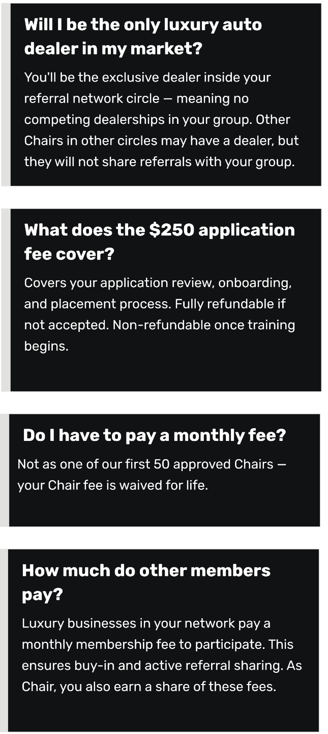 You'll also receive 90 days of territory exclusivity to launch your network before any other Chairs enter your zip codes.